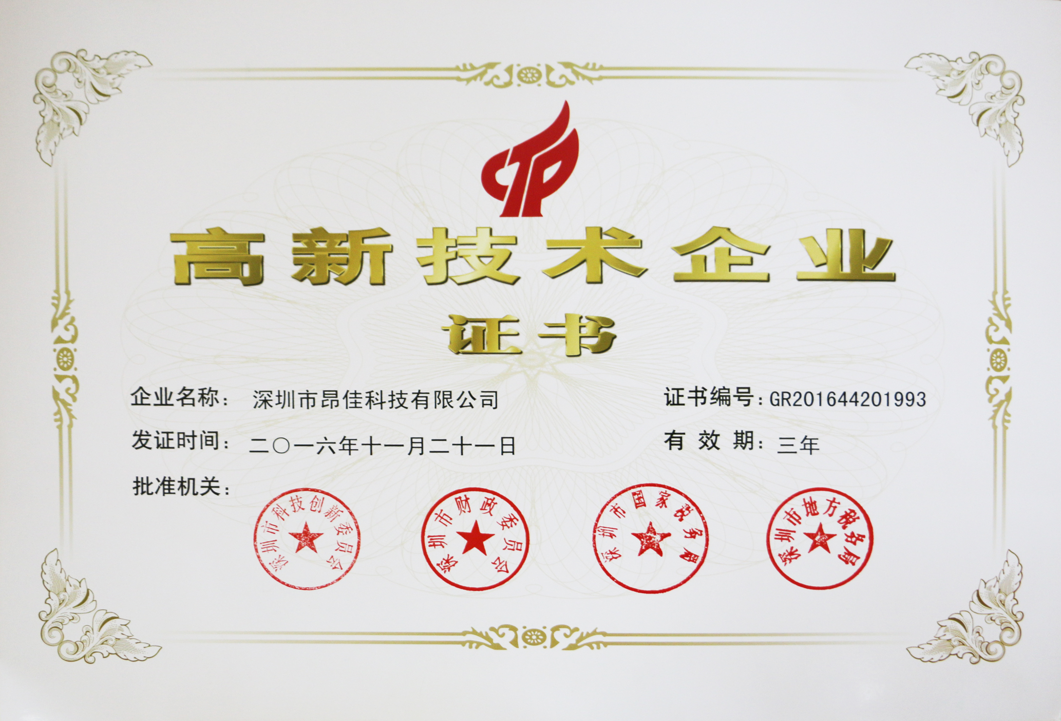 2016年11月21日,深圳市昂佳科技有限公司(以下簡(jiǎn)稱(chēng)昂佳科技)榮獲了由深圳市科技創(chuàng)新委員會(huì)、深圳市財(cái)政委員會(huì)、深圳市國(guó)家稅務(wù)局、深圳市地方稅務(wù)局四部門(mén)聯(lián)合批準(zhǔn)頒發(fā)的深圳市“高新技術(shù)企業(yè)”榮譽(yù)稱(chēng)號(hào),對(duì)于昂佳科技來(lái)說(shuō),不僅是其發(fā)展史上一件里程碑意義的盛事,同時(shí)也代表企業(yè)實(shí)力和科技創(chuàng)新能力受到政府部門(mén)認(rèn)可。